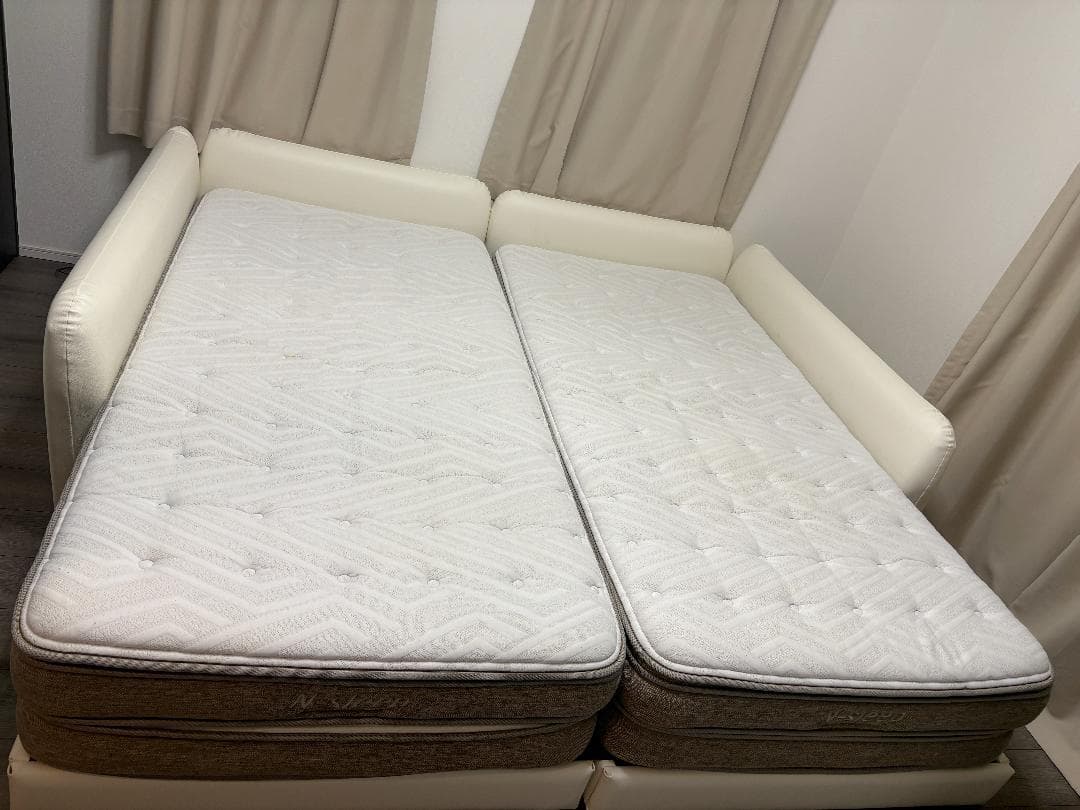 数あるマットレス製品の中きら本品をご覧いただき誠に有難う御座います!2023年2月に購入し使用していたシングル2枚となります。\"洗える\"マットレスという画期的なアイテムで、軽くて収納性もバツグンです。日常的に使用し、何度か洗いメンテナンスしていました。このたび転居のため断捨離として出品いたします。洗えるものですが若干のシミがあり、この点ご了承いただける方にお譲りいたします。状態については商品写真を十分ご確認いただきますようお願いいたします。楽天市場で1枚¥21,780-で購入したので、中古といえど2枚セットでお買い得な価格設定にいたしました。試しに使ってみたい方、なるべく安価に手に入れたい方におすすめです。[商品説明]コンパクトに収納できるマットレス。敷き布団としてもご利用いただけます。多くの方に選ばれているエアリーシリーズが、快適な眠りと朝の目覚めをご提供します。未使用時はコンパクトに収納。かさばらず、扱いやすい。収納ケース付属で持ち運びにも便利。来客用、アウトドアなどにもおすすめです。中材に東洋紡エアロキューブ®を使用。芯材の中身が空洞の中空成形。製品体積の約95%を空気で構成しています。(エアロキューブ®は東洋紡エムシーの三次元網状繊維構造体を示す商標です)優れたクッション性が腰や背中に集中しがちな身体の圧力を上手に分散。身体の沈み込みを支え、理想的な寝姿勢を保ちます。SEK基準「抗菌防臭」と「制菌」をクリア。本体はシャワーなどでの水洗いが可能。いつでも清潔を保てます。※3つ折りタイプはカバーは洗濯機、中材は水洗いが可能です。[サイズ•素材]本品は[シングル・3つ折り]です!●商品サイズ(cm)幅約95×奥行約198×高さ約5●商品重量約4.1kg●組成カバー:ポリエステル100%中材:合成繊維(ポリエーテルエステルエラストマー)●お手入れ方法カバーを洗濯する際は、中材を取り出してください。中材を洗う際は、カバーを外してシャワーや流水で水洗いしてください。洗濯機は使用しないでください。[型式]MAR-S[AI出力情報]- モデル名: エアリーマットレス- 素材: 95%エアー素材- カラー: ベージュMARS-S→MARS-6S IRIS